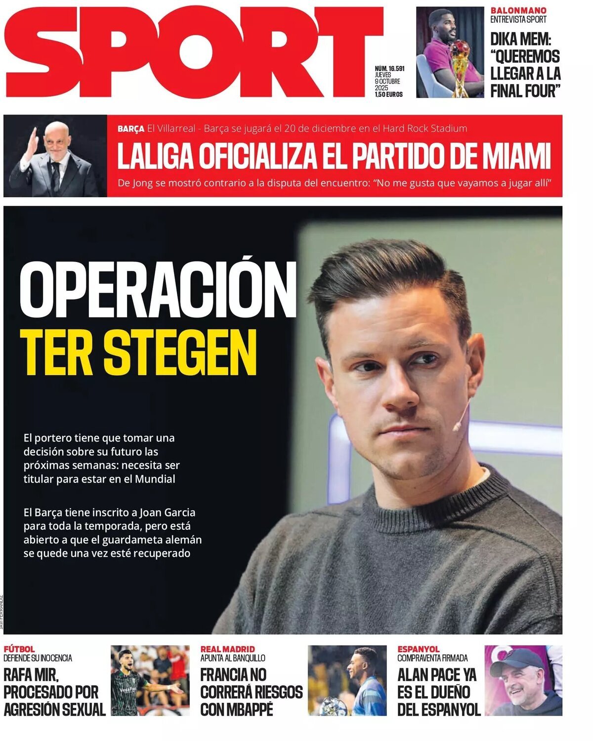 Sport publica que Ter Stegen "tiene que tomar una decisión sobre su futuro las próximas semanas: necesita ser titular para estar en el Mundial. El Barça tiene inscrito a Joan Garcia para toda la temporada pero está abierto a que el guardameta alemán se quede una vez recuperado".