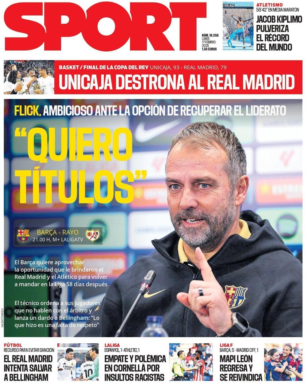 Sport publica que "el Barça quiere aprovechar la oportunidad que le brindaron el Real Madrid y el Atlético para volver a mandar en la Liga 58 días después. El técnico ordenó a sus jugadores que no hablen con el árbitro y lanza un dardo a Bellingham".