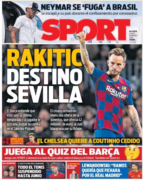 Sport ve a Ivan Rakitic cerca del Sevilla FC el próximo curso: "El Barça entiende que esta será su última temporada y al jugador le gustaría acabar su carrera en el Sánchez Pizjuán. El croata rechazó en enero una oferta de la Juventus, que ofrecía 42 millones de euros al club blaugrana por su fichaje", apunta el diario catalán.