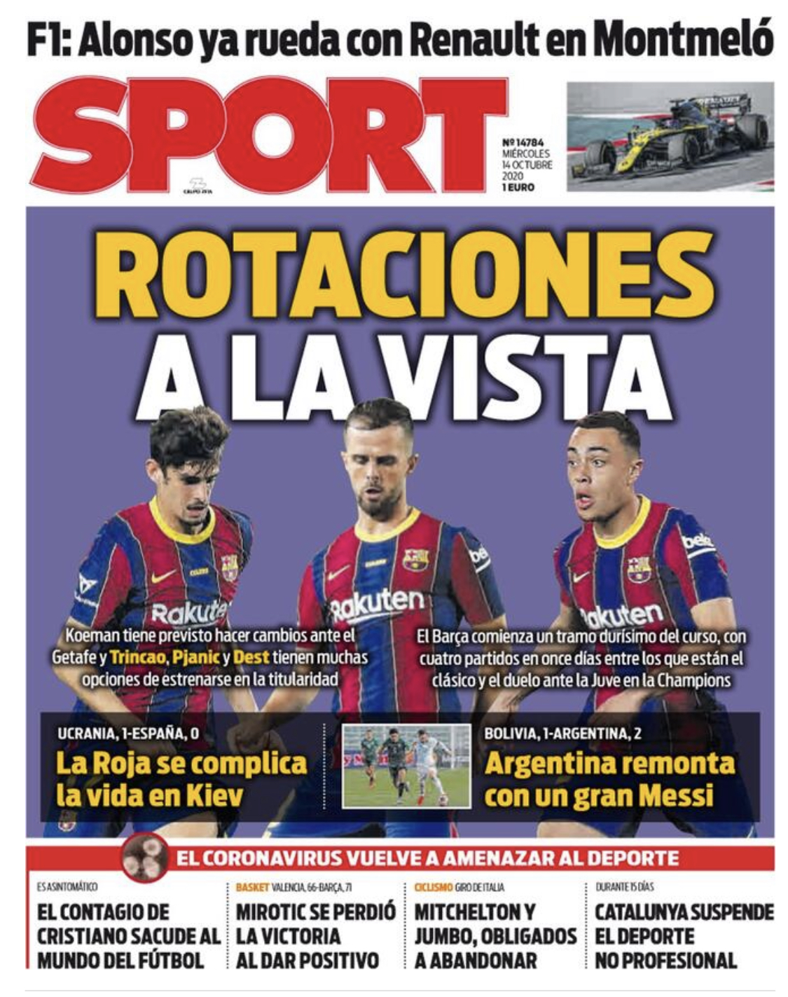 Sport publica en su portada que "Koeman tiene previsto hacer cambios ante el Getafe y Trincao, Pjanic y Dest tienen muchas opciones de estrenarse en la titularidad. El Barça comienza un tramo durísimo del curso, con cuatro partidos en once días entre los que están el Clásico y el duelo ante la Juve en la Champions".
