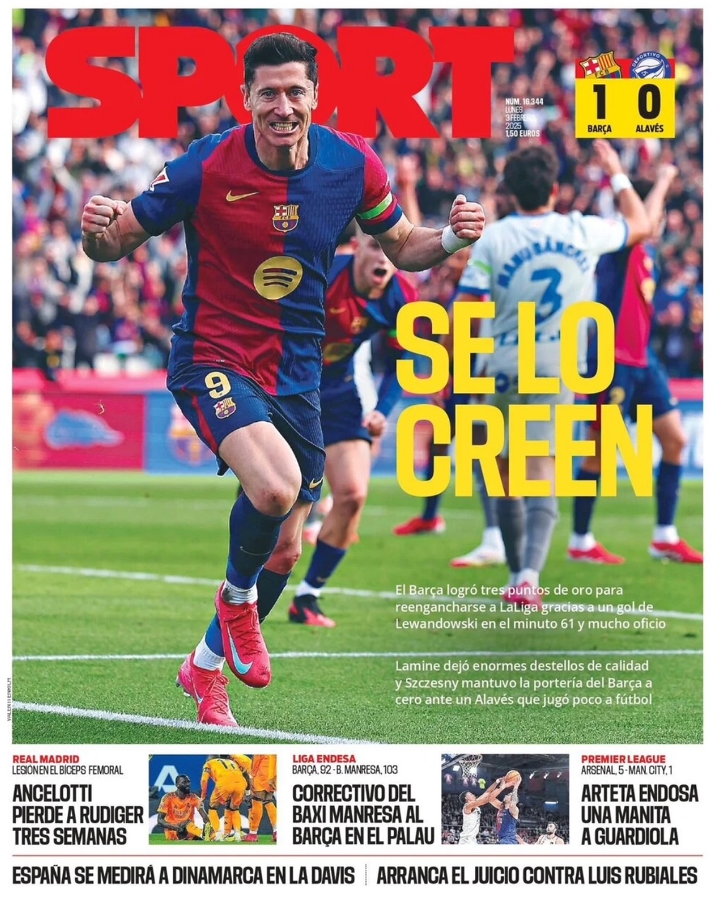 Sport apunta que "el Barça logró tres puntos de oro para reengancharse a la Liga gracias a un gol de Lewandowski en el minuto 61 y mucho oficio. Lamine dejó enormes destellos de calidad y Szczesny mantuvo la portería del Barça a cero ante un Alavés que jugó poco a fútbol".