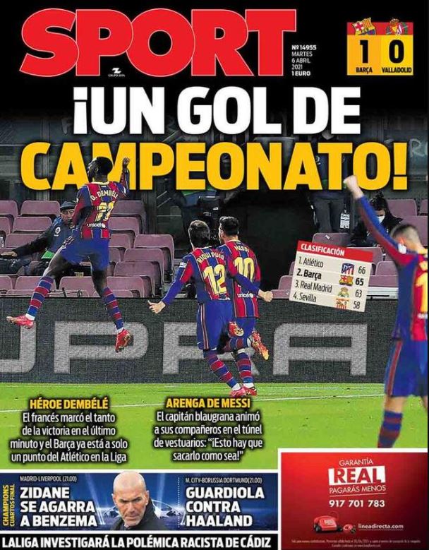 Sport destaca en su portada la victoria del FC Barcelona ante el Real Valladolid: "Dembélé marcó el tanto de la victoria en el último minuto y el Barça ya está a sólo un punto del Atlético en la Liga. Messi animó a sus compañeros en el túnel de vestuarios: "Estoy hay que sacarlo como sea"".