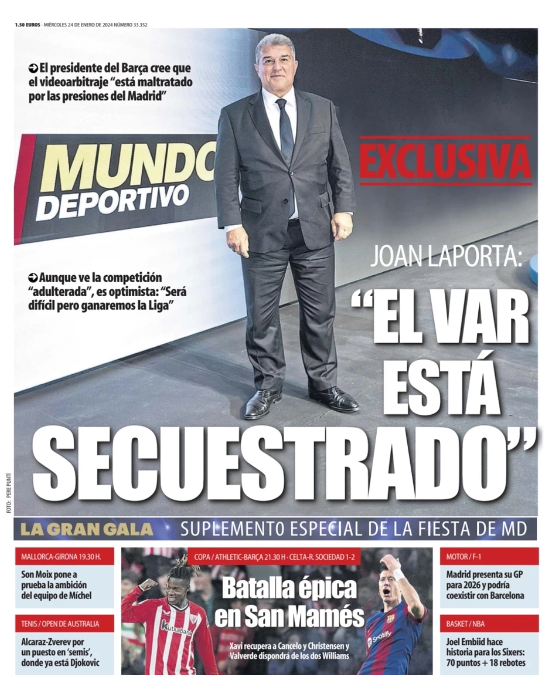 Mundo Deportivo publica una entrevista a Joan Laporta, presidente del FC Barcelona: "Cree que el videoarbitraje está maltratado por las presiones del Madrid, aunque ve la competición adulterada, es optimista".