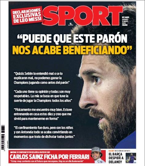 Sport destaca en su portada algunas de las reflexiones de Lionel Messi en la entrevista concedida en las últimas horas: "Quizá Setién lo entendió mal o se lo explicaron mal, no podemos ganar la Champions jugando como antes del parón. Cada uno tiene su opinión y todas son respetables. La mía se basa en que tuve la suerte de jugar la Champions todos los años. Físicamente me encuentro muy bie. Estuve entrenando en casa estos días y creo que me sirvió para mantenerme en forma. El confinamiento fue duro pero con los niños y Antonella todo se acaba convirtiendo en momentos que trato de disfrutar todos juntos".
