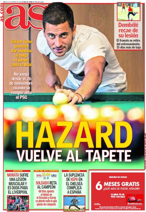 As asegura en su portada que "Zidane tiene previsto dar minutos a Hazard el jueves ante la Real Sociedad. No juega desde el 26 de noviembre cuando se rompió ante el PSG", apunta el diario de la Capital.