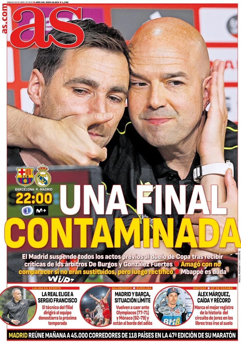As apunta que "el Madrid suspende todos los actos previos al duelo de Copa tras recibir críticas de los árbitros De Burgos y González Fuertes. Amagó con no comparecer si no eran sustituidos pero luego rectificó. Mbappé es duda".