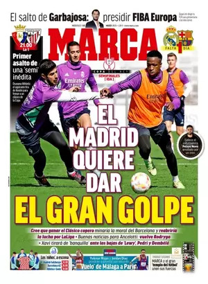 Marca apunta que el Real Madrid "cree que ganar el Clásico copero minaría la moral del Barcelona y reabriría la lucha por la Liga. Buenas noticias para Ancelotti, vuelve Rodrygo. Xavi tirará de banquillo ante las bajas de Lewandowski, Pedri y Dembélé".