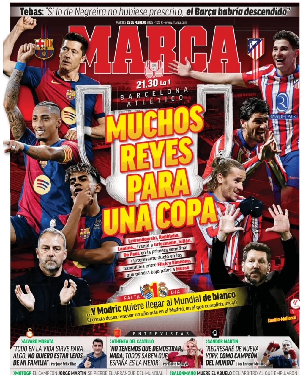 Marca dedica su portada al Barça - Atleti de esta noche: "Lewandowski, Raphinha, Lamine... frente a Griezmann, Julián, De Paul, en la primera semifinal. Interesante duelo en los banquillos entre Flick y Simeone, que pondrá bajo palos a Musso".