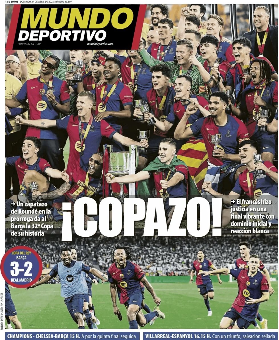 Mundo Deportivo apunta que "un zapatazo de Koundé en la prórroga da al Barça la 32ª Copa de su historia. El francés hizo justicia en una final vibrante con dominio inicial y reacción blanca".