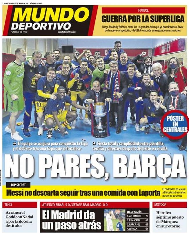 Mundo Deportivo apunta en su portada que el FC Barcelona "se conjura para conquistar la Liga y el doblete tras una Copa que le fortalece. Fiesta total y complicidad entre plantilla, técnico y directiva después del éxito en Sevilla"