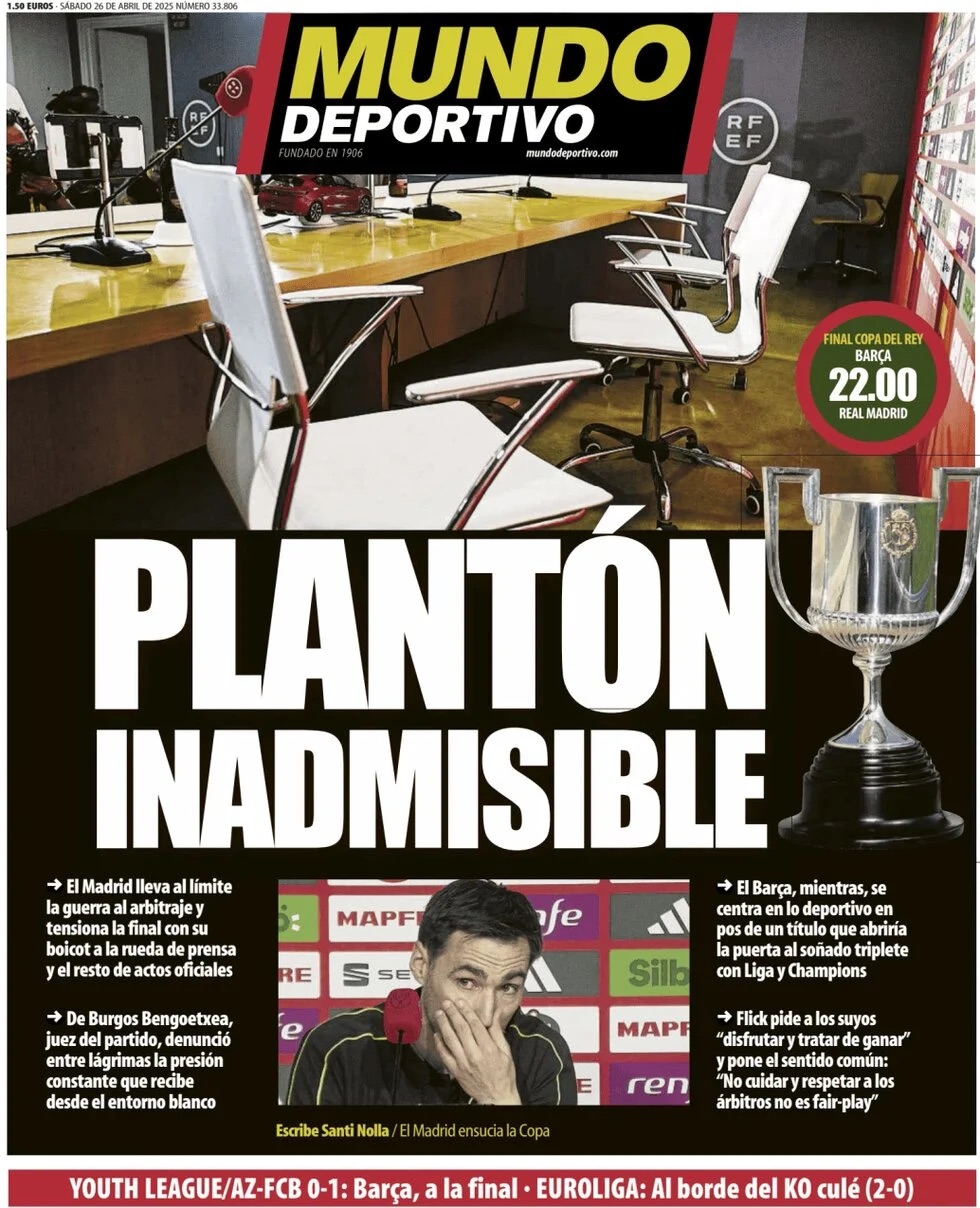 Mundo Deportivo apunta que "el Madrid lleva al límite la guerra al arbitraje y tensiona la final con su boicot a la rueda de prensa y al resto de actos oficiales. De Burgos Bengoetxea, juez del partido, denunció entre lágrimas la presión constante que recibe desde el entorno blanco. El Barça, mientras, se centra en lo deportivo en pos de un título que abriría la puerta al soñado triplete con Liga y Champions".