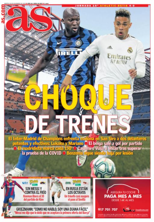As apunta que "el Inter-Madrid de Champions enfrenta mañana en San Siro a dos delanteros potentes y efectivos, Lukaku y Mariano. El belga sale a gol por partido. El madridista marca cada 130 minutos. Casemiro viaja a Milán tras superar la prueba de la COVID. Benzema sigue siendo baja por lesión".