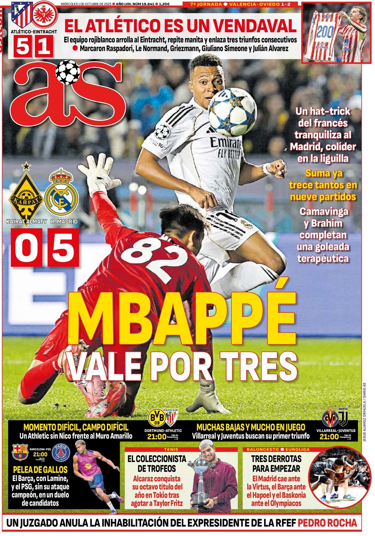 As apunta que "un 'hat-trick' de Kylian Mbappé tranquiliza al Madrid, colíder en la liguilla. Suma ya trece tantos en nueve partidos. Camavinga y Brahim completan una goleada terapéutica".