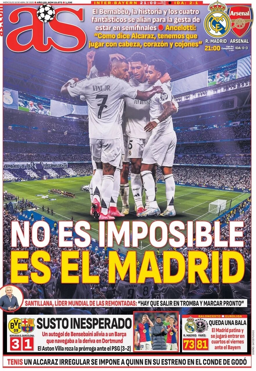 As dedica su portada al Real Madrid - Arsenal que se escenifica en la Capital esta noche a partir de las 21 horas: "El Bernabéu, la historia y los cuatro fantásticos se alían para la gesta de estar en semifinales".