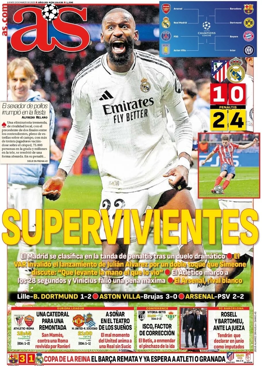 As apunta que "el Madrid se clasifica en la tanda de penaltis tras un duelo dramático. El VAR invalidó el lanzamiento de Julián Álvarez por doble toque que Simeone discute. El Atlético marcó a los 28 segundos y Vinícius falló una pena máxima. El Arsenal, rival blanco".