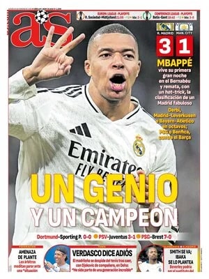 As publica en su portada que "Mbappé vive su primera gran noche en el Bernabéu y remata, con un 'hat-trick', la clasificación de un Madrid fabuloso. Derbi, Madrid-Leverkusen o Bayern-Atlético en octavos; PSG o Benfica contra el Barça".