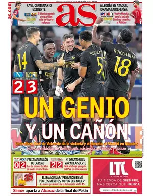 As apunta que "un trallazo final de Valverde da la victoria y el liderato al Madrid en Nápoles. Nueva exhibición de Bellingham: asistencia a Vinícius y golazo".