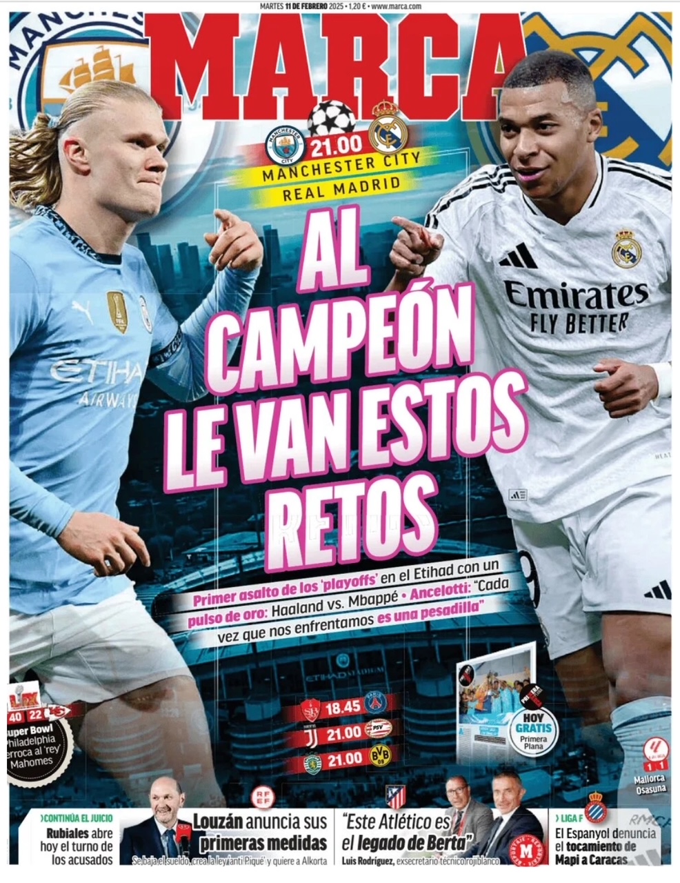 Marca dedica su portada al Manchester City - Real Madrid de esta noche: "Primer asalto de los 'Play-offs' en el Etihad con un pulso de oro, Haaland vs Mbappé". El diario publica una de las frases de Carlo Ancelotti: "CAda vez que nos enfrentamos es una pesadilla".