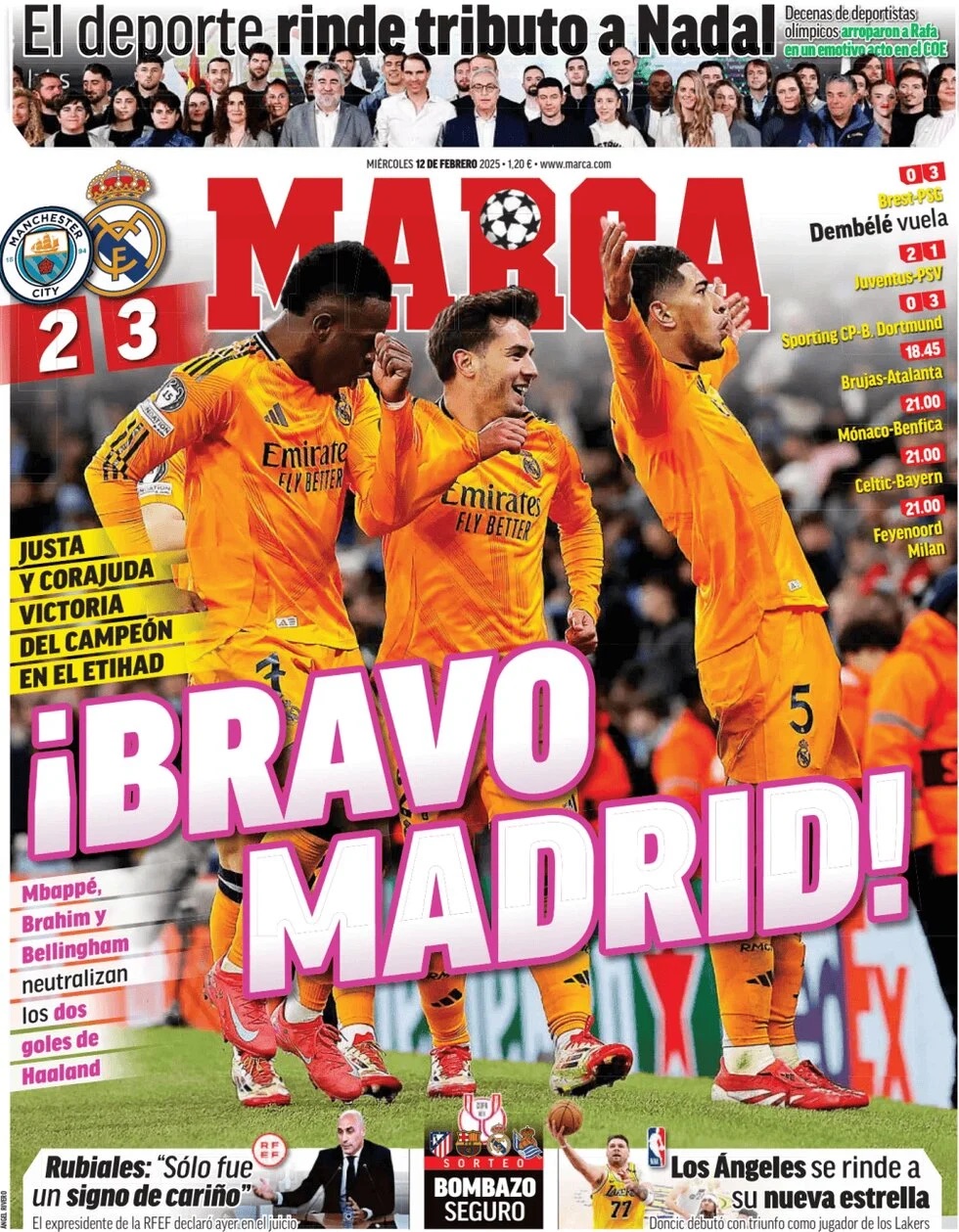 Marca apunta que "Mbappé, Brahim y Bellingham neutralizan los dos goles de Haaland, justa y corajuda victoria del campeón en el Etihad". Espacio para el sorteo de las semifinales de la Copa del Rey, que se celebra hoy con Atlético, Barcelona, Real Madrid y Real Sociedad en liza.