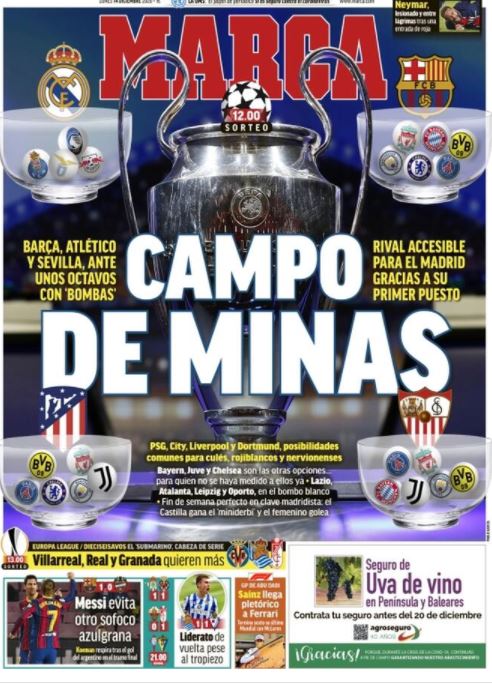 Marca destaca en su portada la dificultad que presentará el sorteo de octavos de final para tres de los representantes del fútbol español en la Champions League: "Barça, Atlético y Sevilla ante unos octavos con bombas. Rival accesible para el Madrid gracias a su primer puesto".