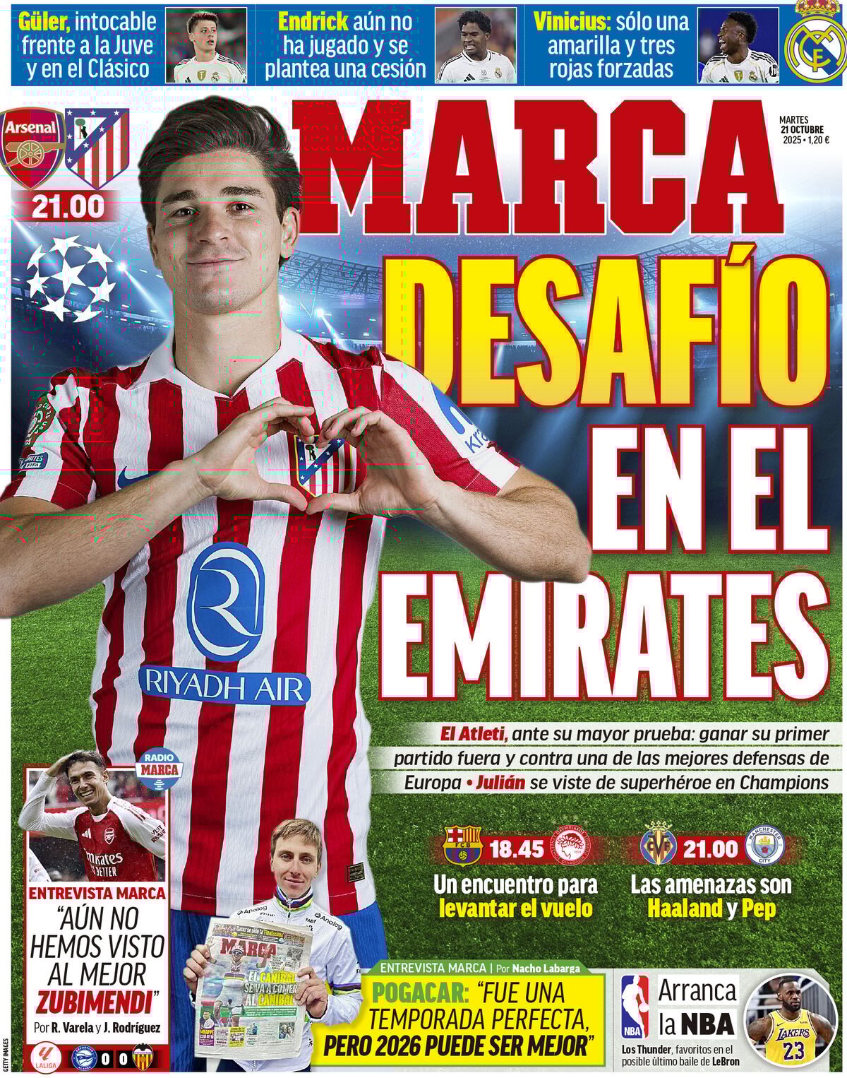 Marca dedica su portada a la vista del Atlético de Madrid al Emirates de Londres: "El Atleti ante su mayor prueba, ganar su primer partido fuera y contra una de las mejores defensas de Europa. Julián se viste de superhéroe en la Champions".
