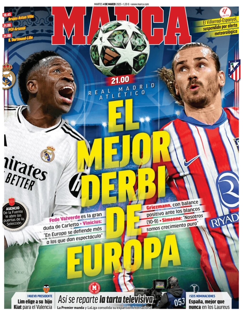 Marca apunta que "Fede Valverde es la gran duda de Ancelotti. Griezmann, con balance positivo ante el Real Madrid". El diario agrega una de las frases de Vinícius Júnior en la previa: "En Europa se defiende más a los que dan espectáculo".