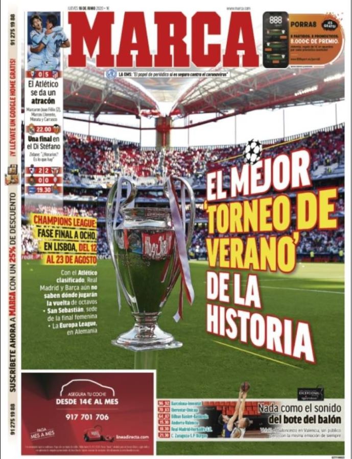Marca también destaca la confirmación de la fórmula de disputa de la Champions League en sus últimas rondas: "Con el Atlético clasificado, Real Madrid y Barça aún no saben dónde jugarán la vuelta de octavos. San Sebastián, sede de la final femenina. La Europa League, en Alemania".