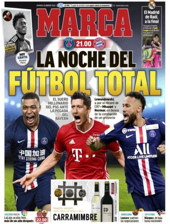 Marca dedica su portada a la disputa de la final de la Champions League: "El sueño millonario del PSG ante la pegada del Bayern. Lewandowski a por el record de CR7. Mbappé y Neymar en busca de la coronación de un proyecto
