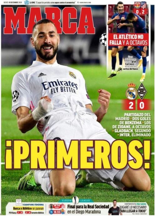 Marca destaca en su portada la victoria del Real Madrid ante el Borussia Mönchengladbach: "Partidazo del Madrid, dos goles de Benzema. Los de Zidane, a octavos. Gladbach, segundo, Inter eliminado".