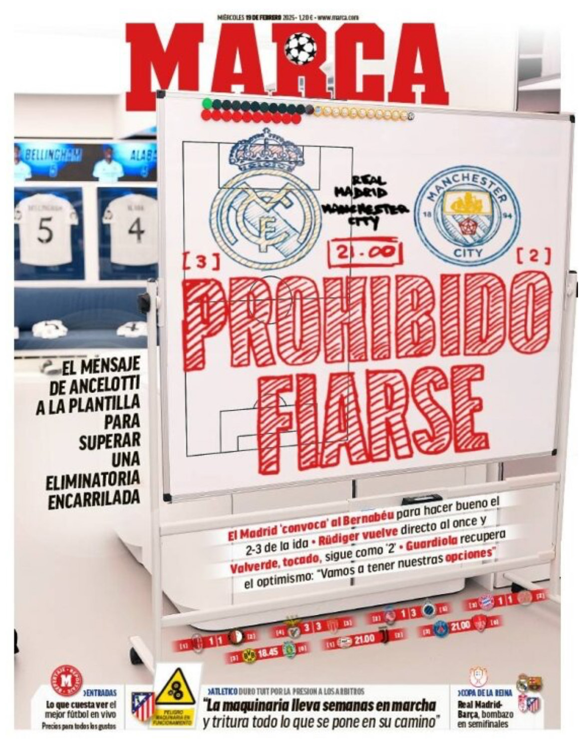 Marca apunta que "el Madrid 'convoca' al Bernabéu para hacer bueno el 2-3 de la ida. Rüdiger vuelve directo al once y Valverde, tocado, sigue como '2'. Guardiola recupera el optimismo".