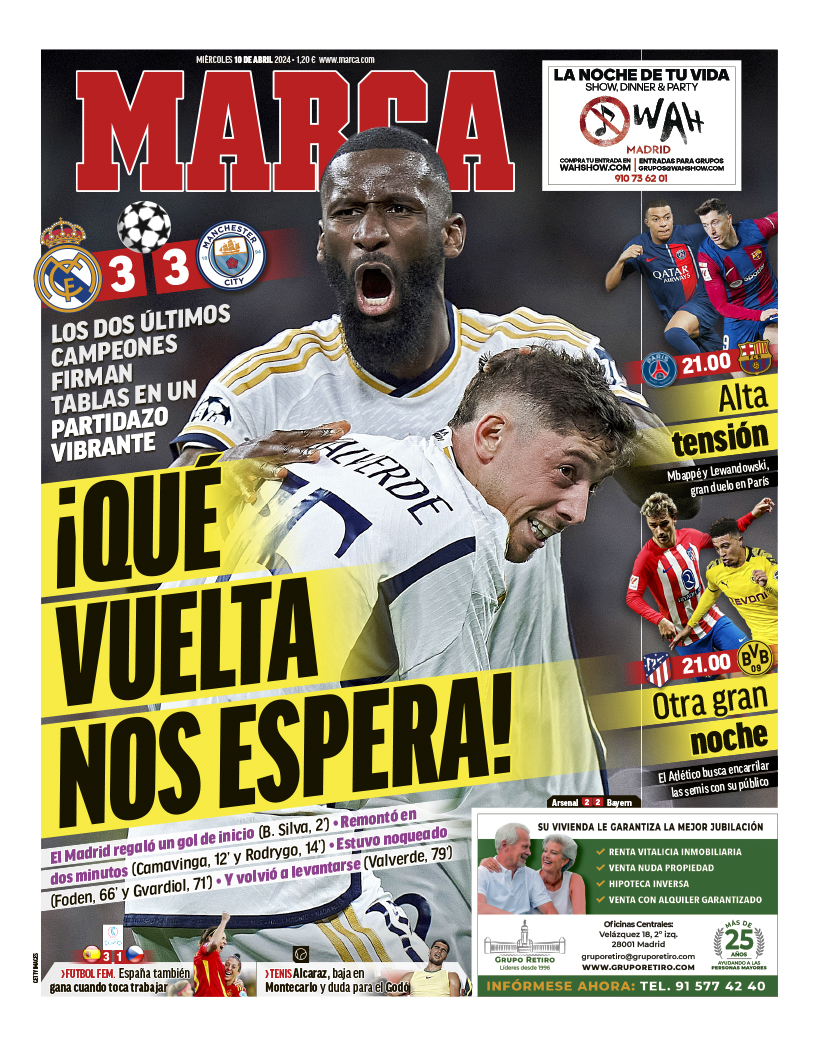 Marca dedica su portada al empate entre Real Madrid y Manchester City: "El Madrid regaló un gol de inicio, remontó en dos minutos, estuvo noqueado y volvió a levantarse".