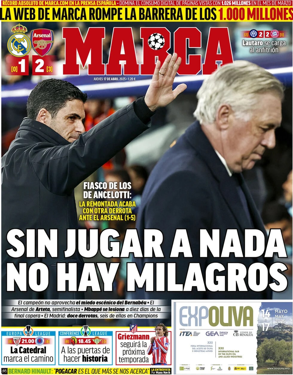 Marca apunta que "el campeón no aprovecha el miedo escénico del Bernabéu. El Arsenal de Arteta, semifinalista. Mbappé se lesiona a diez días de la final copera. El Madrid, doce derrotas, seis de ellas en Champions"