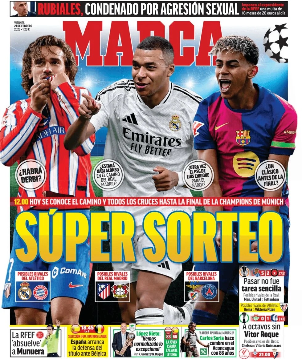Marca publica en su portada que "hoy a las 12 se conoce el camino y todos los cruces hasta la final de la Champions League", con tres clubes españoles en liza en la ronda de Octavos: Atlético de Madrid, Barcelona y Real Madrid.
