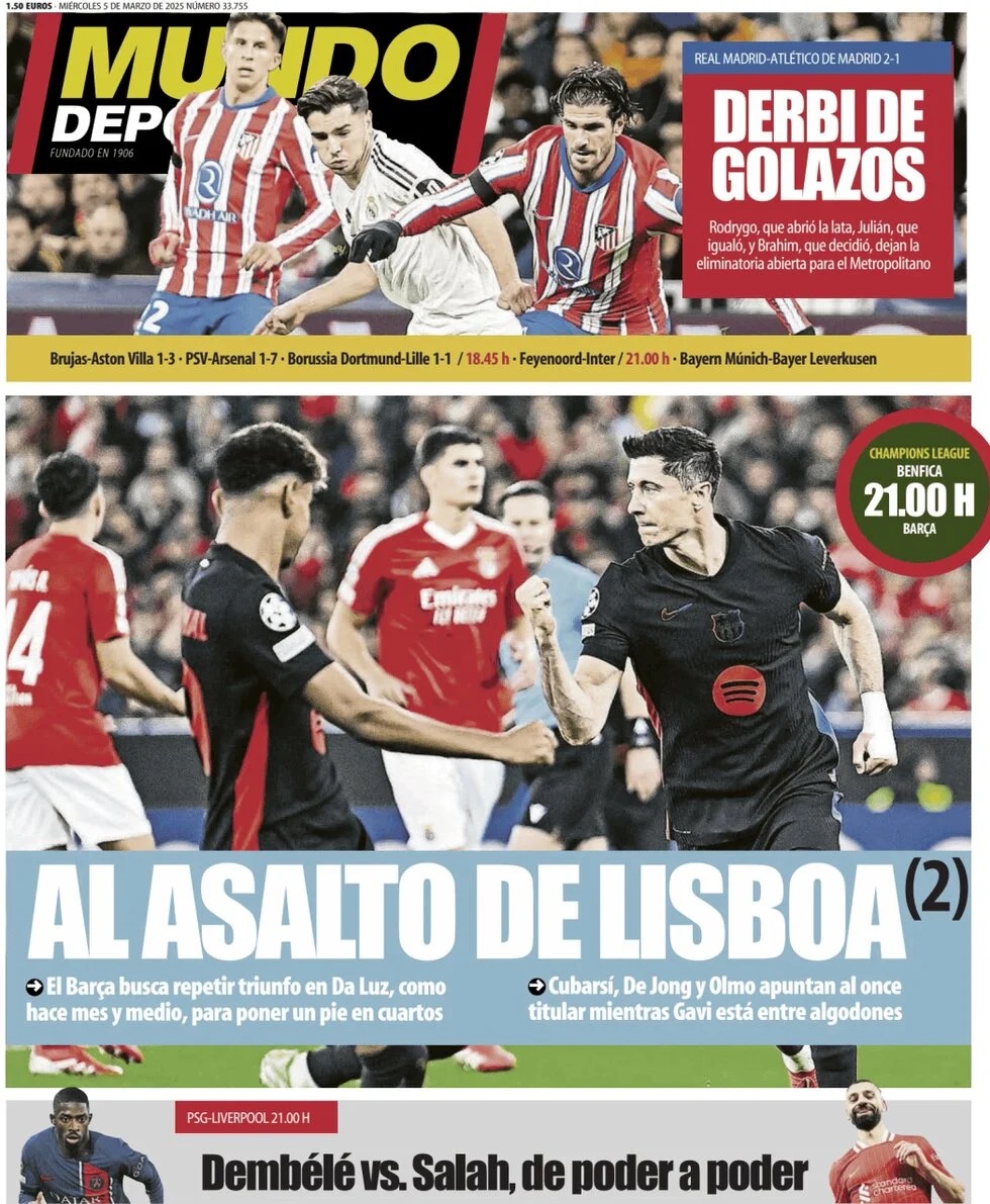 Mundo Deportivo apunta que "el Barça busca repetir triunfo en Da Luz, como hace mes y medio, para poner un pie en Cuartos. Cubarsí, De Jong y Olmo apuntan al once titular mientras Gavi está entre algodones".