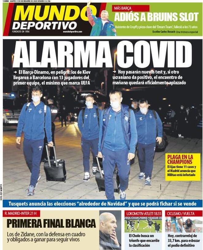 Mundo Deportivo destaca el elevado número de positivos por coronavirus del Dynamo Kiev: "El partido en peligro, los ucranianos llegaron a Barcelona con 13 jugadores del primer equipo, el mínimo que marca UEFA. Hoy pasarán nuevos test y si otro jugador da positivo, el encuentro de mañana quedará oficialmente aplazado".
