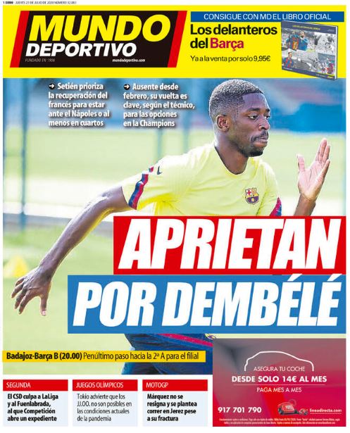 Mundo Deportivo apunta en su portada que "Setién prioriza la recuperación de Dembélé para estar ante el Napoli o al menos en cuartos. Ausente desde febrero, su vuelta es clave, según el técnico, para las opciones en la Champions".