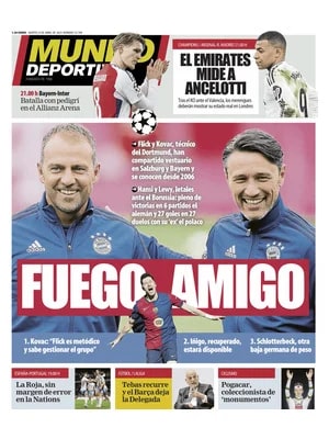 Mundo Deportivo destaca en su portada que "Flick y Kovac, técnico del Dortmund, han compartido vestuario en Salzburg y Bayern y se conocen desde 2006. Hansi y Lewy, letales ante el Borussia: pleno de victorias en 6 partidos el alemán y 27 goles en 27 duelos con su 'ex' el polaco".