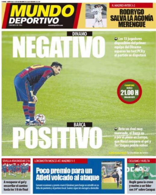 Mundo Deportivo dedica su portada al Barça-Dynamo de esta noche: "Los 13 jugadores disponibles del primer equipo del Dynamo superan los test PCR y el partido se disputará. Ante un rival muy mermado, el Barça va a por el pleno en Europa, que Messi recupere el gol y Ter Stegen podría volver".