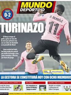 Mundo Deportivo dedica su portada a la victoria del FC Barcelona ante la Juventus: "El Barça rompe el gafe y gana en casa de la Juve por primera vez con un obús de Dembélé y un penalti de Messi. Gran recital de Pedri, De Jong acaba de central por lesión de Araújo y tres goles anulados a Morata por fuera de juego".