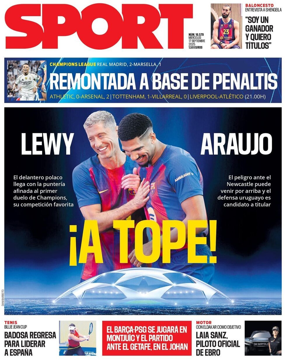 Sport apunta que Lewandowski "llega con la puntería afinada al primer duelo de Champions, su competición favorita. El peligro del Newcastle puede venir por arriba y Araujo es candidato a titular".
