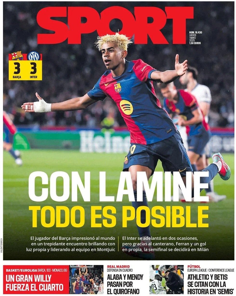 Sport apunta que Lamine Yamal "impresionó al mundo en un trepidante encuentro brillando con luz propia y liderando al equipo en Montjuïc. El Inter se adelantó en dos ocasiones, pero gracias al canterano, Ferrran y un gol en propia puerta, la semifinal se decidirá en Milán".