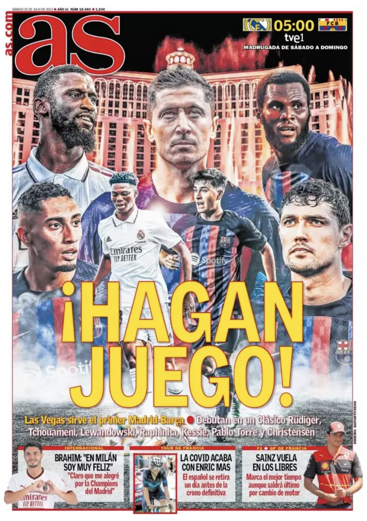 As publica que "Las Vegas sirve el primer Madrid - Barça. Debutan en un Clásico Rüdiger, Tchouaméni, Lewandowski, Raphinha, Kessie, Pablo Torre y Christensen".