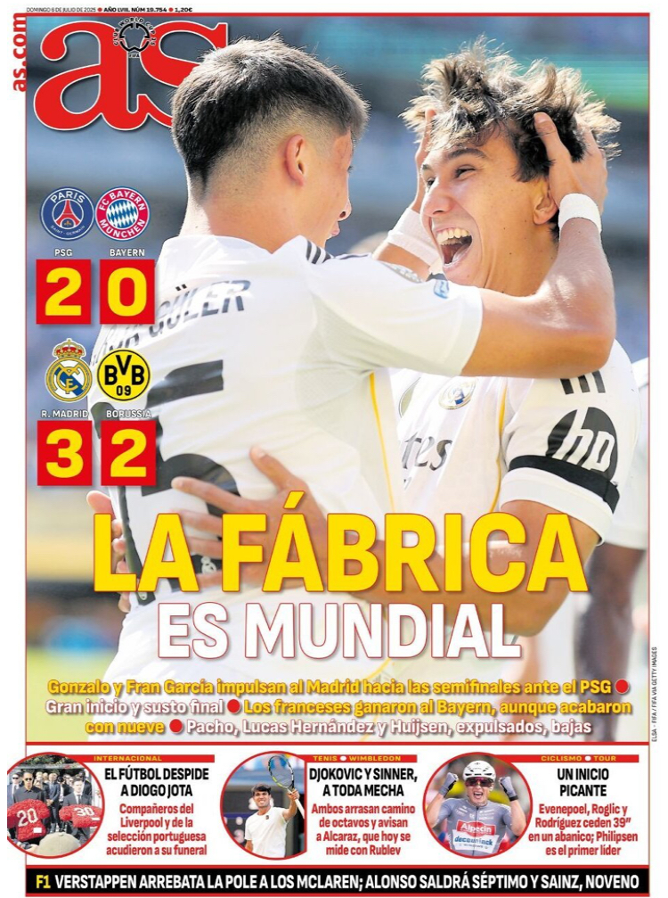 As apunta que "Gonzalo y Fran García impulsan al Madrid hacia las semifinales ante el PSG. Gran inicio y susto final. Los franceses ganaron al Bayern, aunque acabaron con nueve. Pacho, Lucas Hernández y Huijsen, expulsados, bajas".