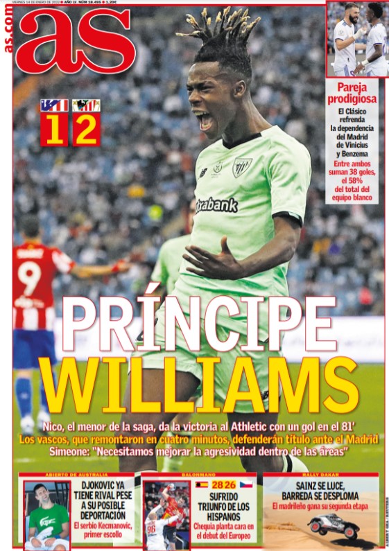 As también destaca en su portada la victoria del Athletic ante el Atlético: "Nico, el menor de la saga, da la victoria al Athletic con un gol en el minuto 81. Los vascos, que remontaron en cuatro minutos, defenderán título ante el Madrid".
