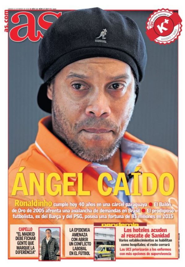 As resalta en su portada la situación de Ronaldinho: "Cumple hoy 40 años en una cárcel paraguaya. El Balón de Oro de 2005 afronta una avalancha de demandas en Brasil. El prodigioso futbolista, ex del Barça y del PSG, poseía una fortuna de 83 millones en 2015", apunta el diario madrileño.