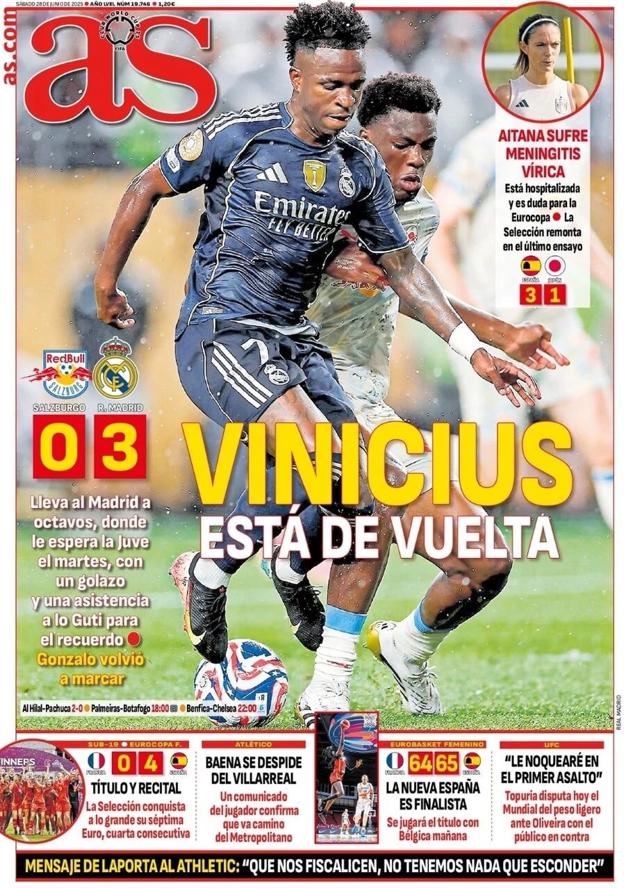 As publica que Vinícius Júnior "lleva al Madrid a octavos, donde le espera la Juve el martes, con un golazo y una asistencia a lo Guti para el recuerdo. Gonzalo volvió a marcar".