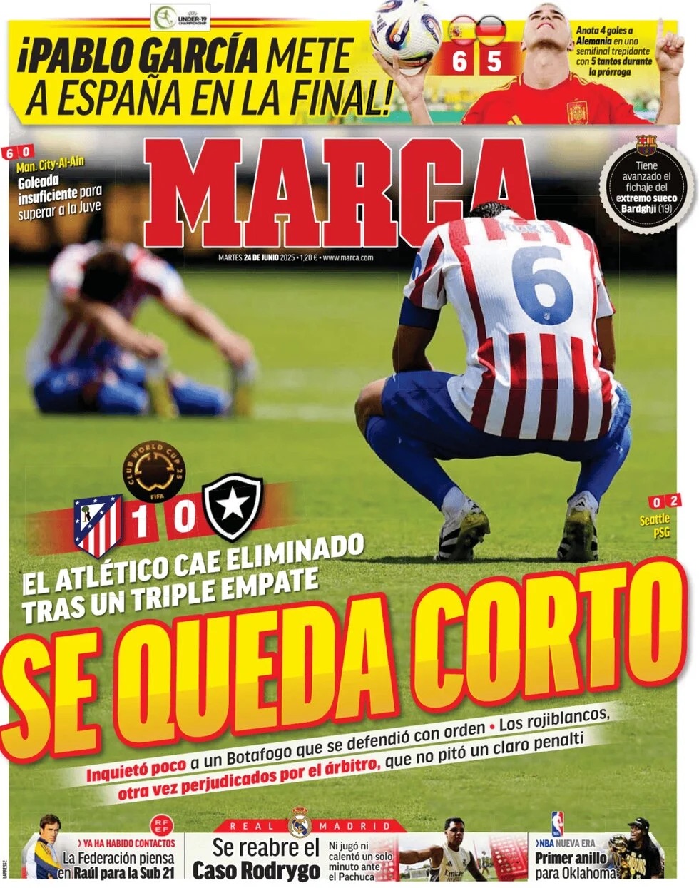 Marca apunta que el Atlético "inquietó poco a un Botafogo que se defendió con orden. Los rojiblancos, otra vez perjudicados por el árbitro, que no pitó un claro penalti".