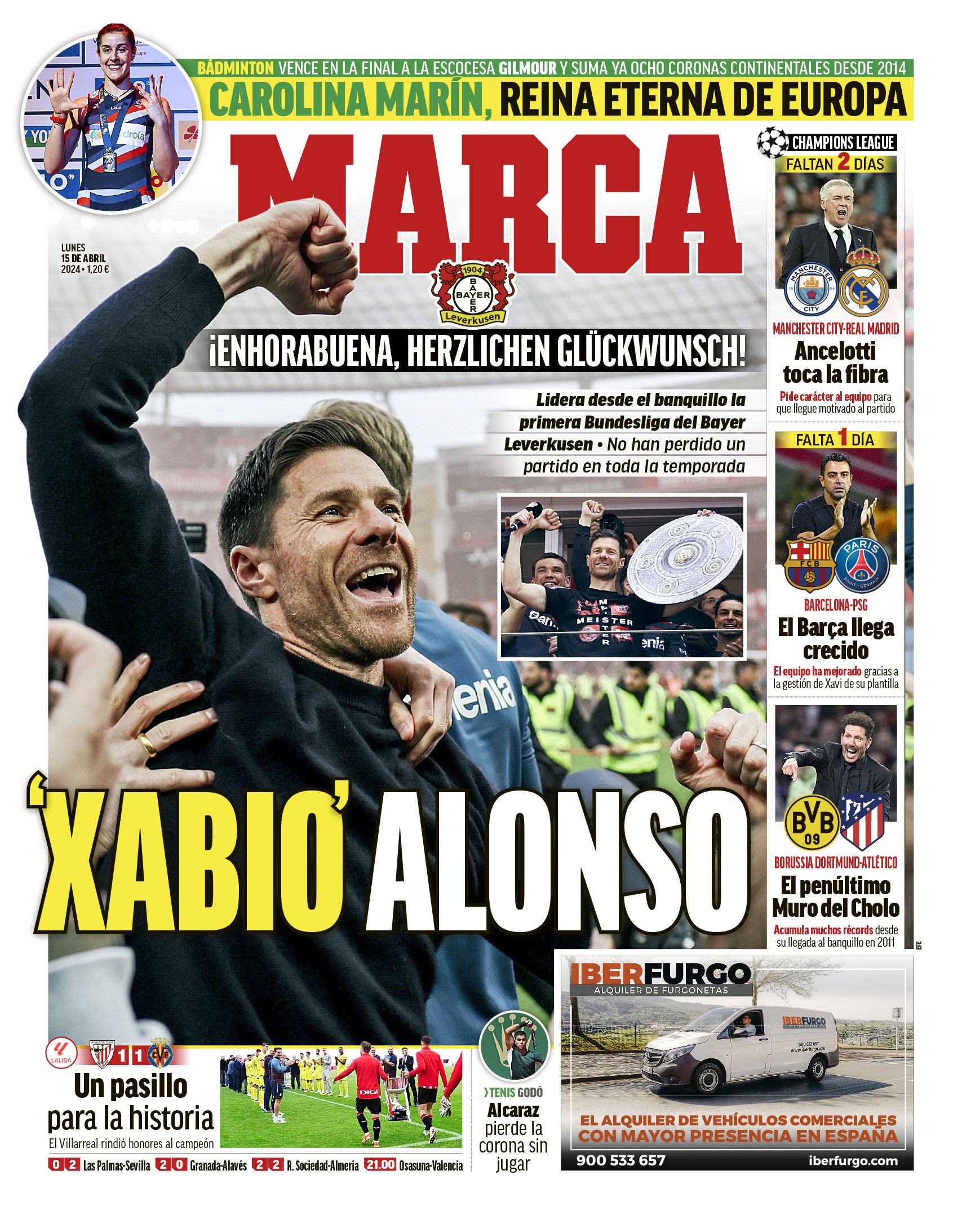 Marca también dedica su portada a Xabi Alonso: "Lidera desde el banquillo la primera Bundesliga del Bayer Leverkusen. No han perdido un partido en toda la temporada".
