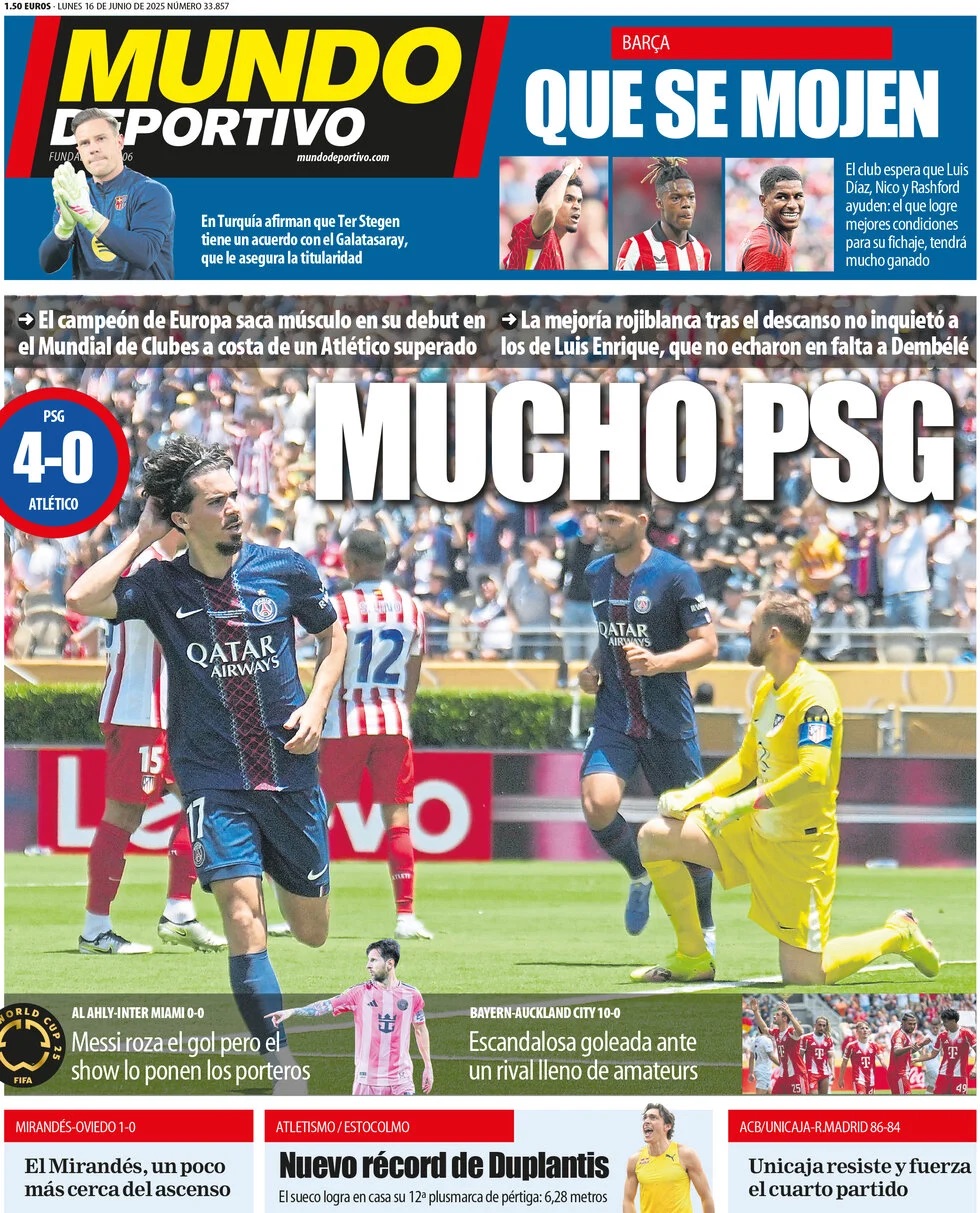 Mundo Deportivo apunta que "el campeón de Europa saca músculo en su debut en el Mundial de Clubes a costa de un Atlético superado. La mejoría rojiblanca tras el descanso no inquietó a los de Luis Enrique, que no echaron en falta a Dembélé.