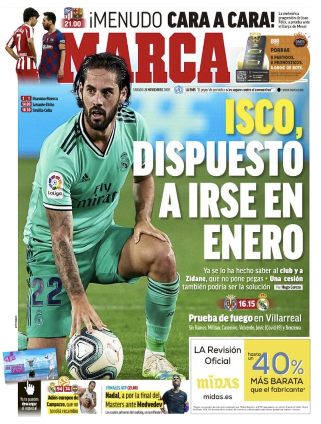Marca asegura que Isco "ya le ha hecho saber al Real Madrid y a Zidane que no pone pegas. Una cesión también podría ser la solución". Espacio también para el complicado desplazamiento de los blancos al Estadio de La Cerámica.
